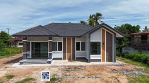 บ้านหลังนี้เป็น บ้านชั้นเดียวสไตล์ร่วมสมัย (Contemporary Style) ที่ออกแบบให้มีความเรียบหรูและทันสมัย ตัวบ้านใช้โทนสีเทา ขาว และตัดด้วยสีน้ำตาลไม้ ซึ่งช่วยเพิ่มความอบอุ่นและทำให้บ้านดูมีมิติไม่น่าเบื่อ การออกแบบโดยรวมเน้นเส้นสายที่ดูเรียบง่าย แต่แฝงไปด้วยรายละเอียดที่ช่วยเพิ่มความสวยงามให้กับตัวบ้าน