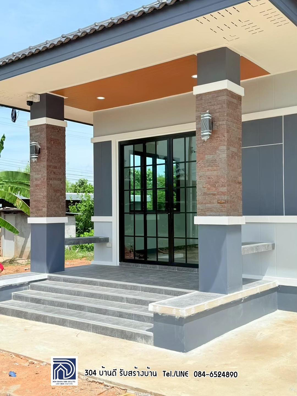 บริเวณด้านหน้าบ้านมี เฉลียงพร้อมบันไดทางขึ้น ออกแบบให้มีพื้นที่สำหรับนั่งพักผ่อน รับลม หรือใช้เป็นมุมต้อนรับแขกได้อย่างสบาย เสาหน้าบ้านตกแต่งด้วยวัสดุลายหินและโทนสีเข้ม ช่วยเพิ่มความโดดเด่นให้กับตัวบ้าน