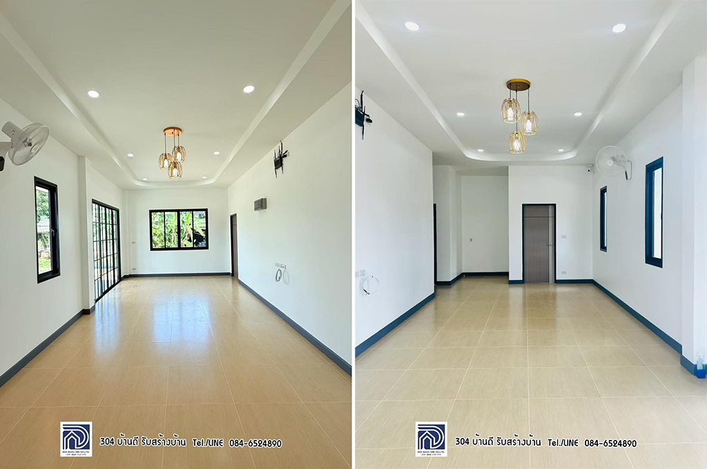พื้นปูด้วยกระเบื้องโทนสีครีมดูอบอุ่น ทำความสะอาดง่าย ส่วนฝ้าเพดานออกแบบเป็น ฝ้าหลุมพร้อมไฟดาวน์ไลท์และโคมไฟตกแต่ง ช่วยเพิ่มความทันสมัยและความสวยงามให้กับตัวบ้าน