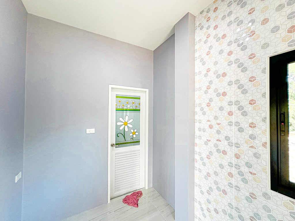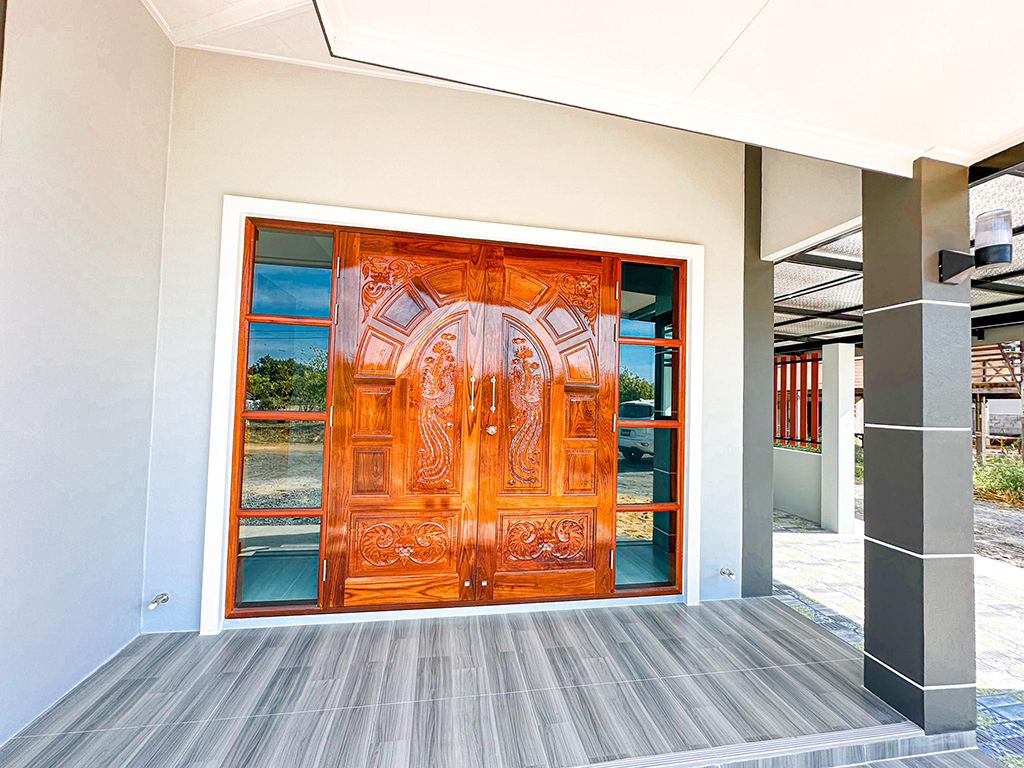 ด้านหน้าบ้านมีเฉลียงเล็ก ๆ พร้อมบันไดทางขึ้นที่ออกแบบอย่างเรียบร้อย แข็งแรง ปูด้วยกระเบื้องโทนสีเทาเข้าชุดกับตัวบ้าน ประตูหน้าบ้านเลือกใช้ประตูไม้บานคู่แกะลวดลายสวยงาม เพิ่มความรู้สึกอบอุ่นและหรูหราในเวลาเดียวกัน