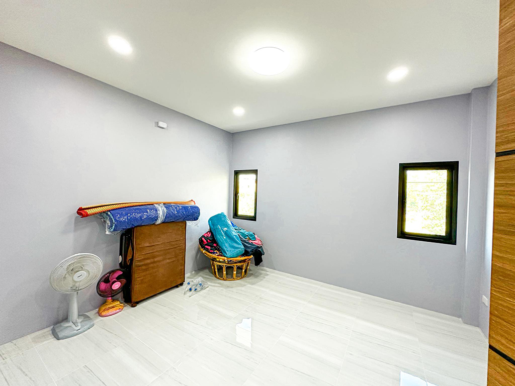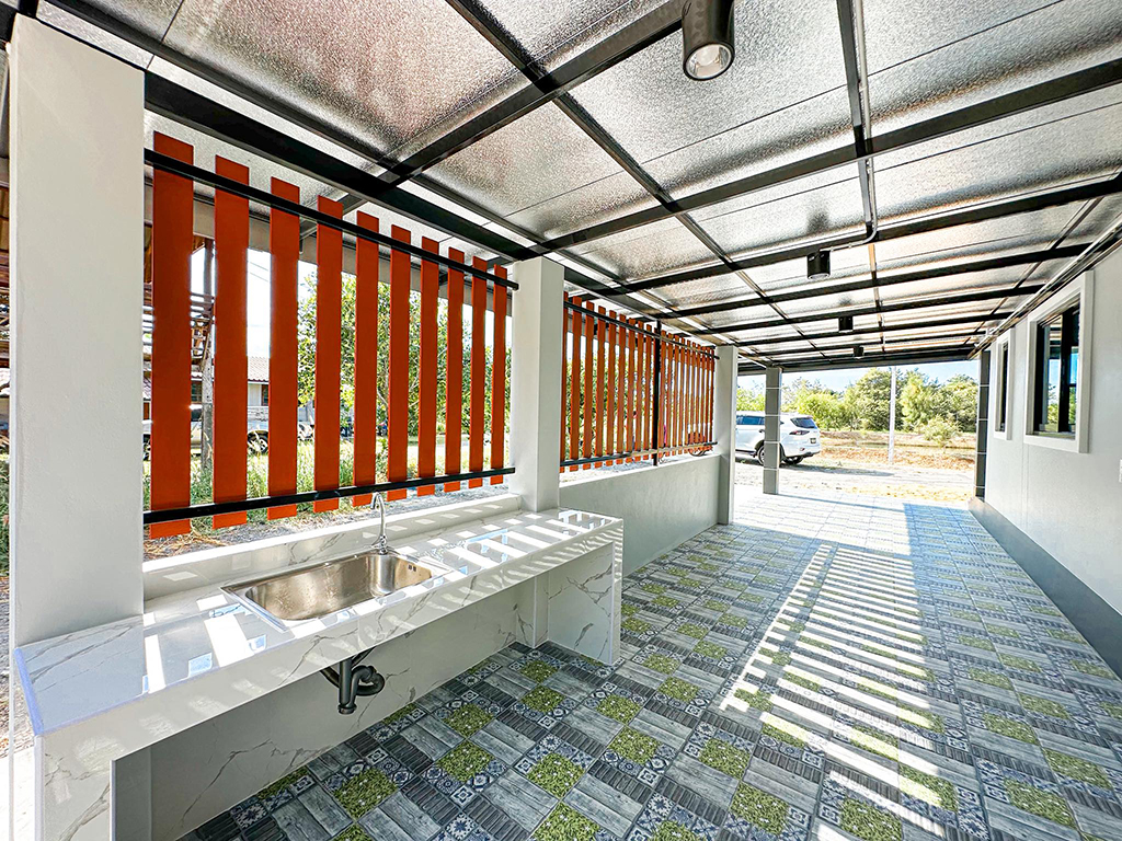 จุดเด่นสำคัญของบ้านหลังนี้คือ โรงจอดรถในตัวบ้าน ที่ออกแบบให้เชื่อมต่อกับตัวบ้านอย่างลงตัว หลังคายื่นยาว รองรับรถยนต์ได้อย่างสะดวกสบาย ช่วยป้องกันแดดและฝน เหมาะกับไลฟ์สไตล์ครอบครัวยุคใหม่ที่ต้องการความสะดวกครบในพื้นที่เดียว