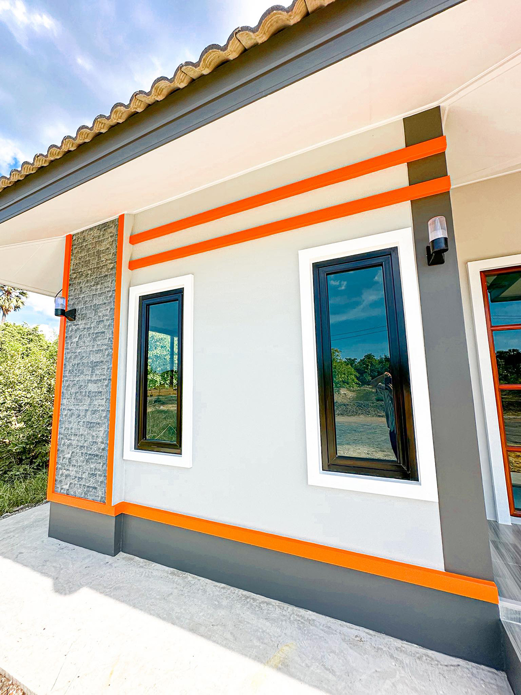 ผนังภายนอกเลือกใช้โทนสีเทาอ่อนตัดกับฐานบ้านสีเทาเข้ม ดูสะอาดตาและดูแลรักษาง่าย เพิ่มลูกเล่นด้วยกรอบเส้นสีส้มบริเวณมุมผนังและขอบหน้าต่าง ช่วยให้ตัวบ้านดูมีมิติ ไม่เรียบจนเกินไป และสะท้อนความเป็นบ้านสไตล์โมเดิร์นได้อย่างชัดเจน
