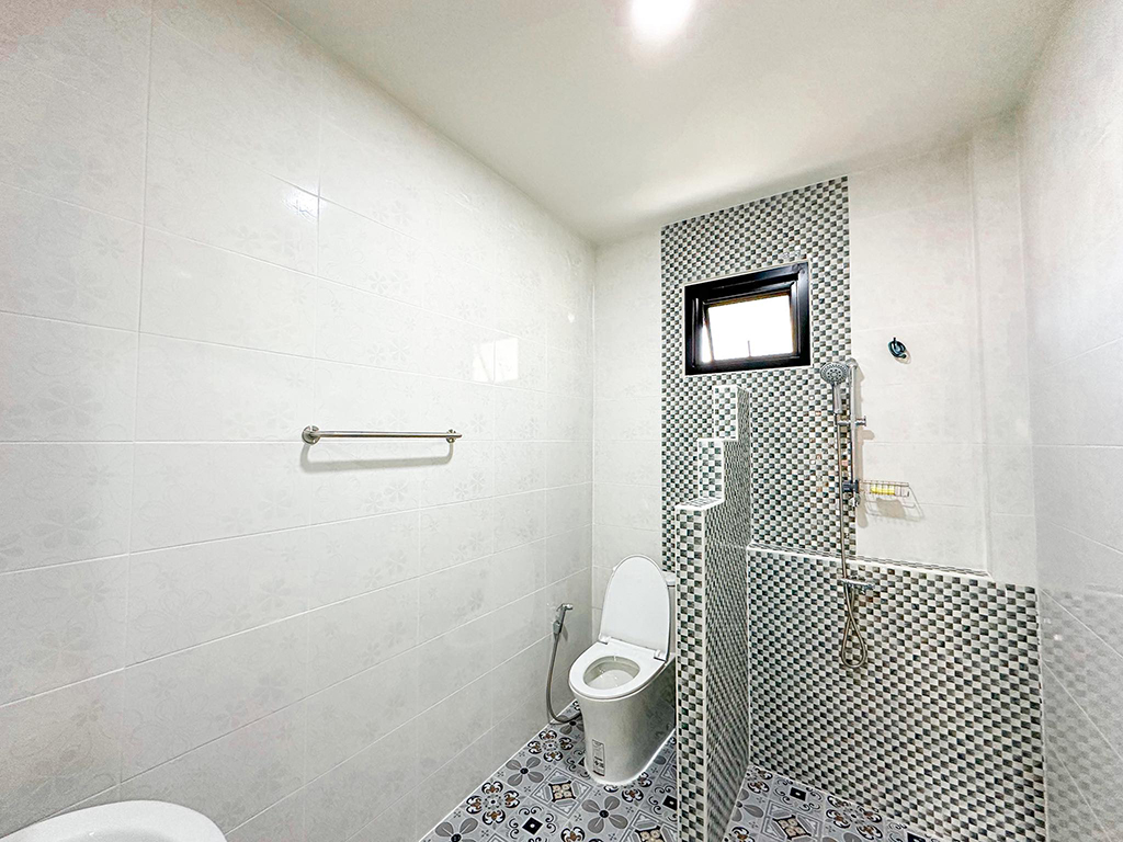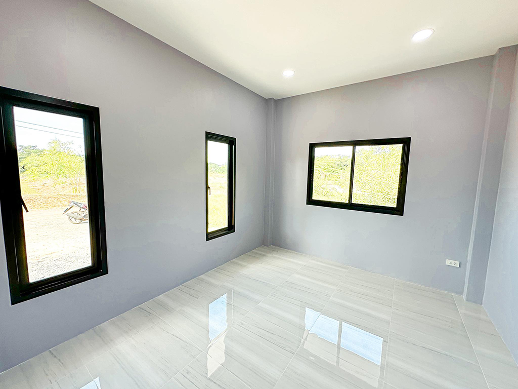 บริเวณหน้าต่างเป็นกระจกบานสูงกรอบสีเข้ม ช่วยรับแสงธรรมชาติให้ภายในบ้านสว่าง โปร่ง และประหยัดพลังงานในช่วงกลางวัน อีกทั้งยังช่วยให้บ้านดูทันสมัยมากยิ่งขึ้น