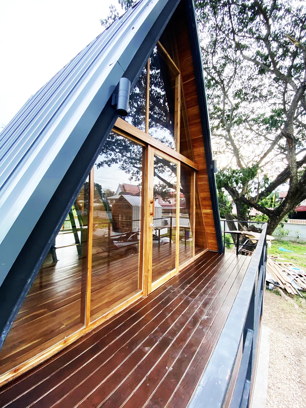 บ้านทรงเอเฟรม ดีไซน์สวยโดดเด่นไม่ซ้ำใคร โครงสร้างเหล็กถูกมิกซ์กับไม้สัก