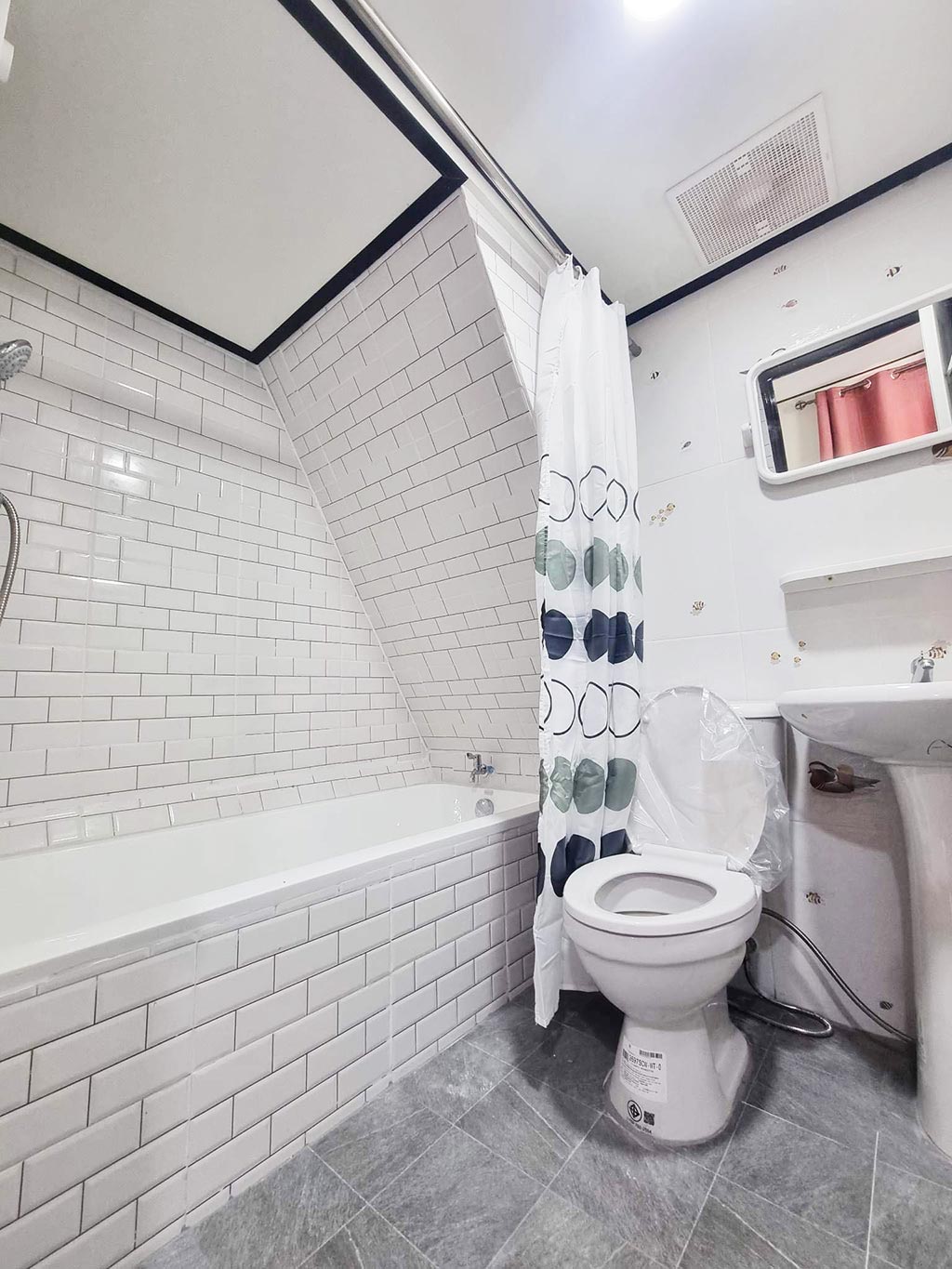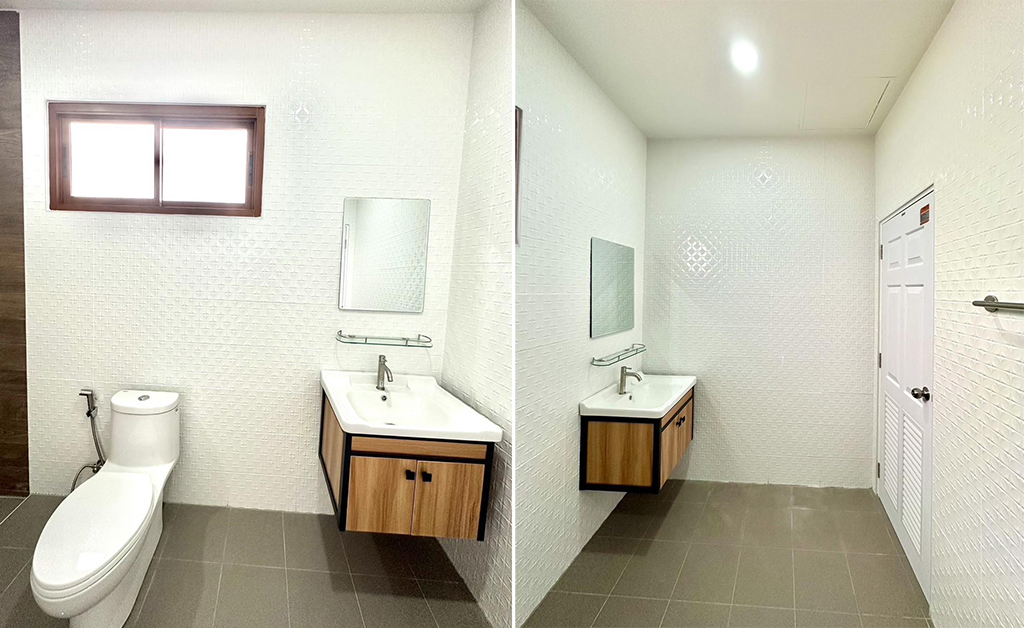 ห้องน้ำออกแบบด้วยลานหินอ่อนสีดำและมีรูปแบบการใช้งานที่ทันสมัย ด้วยลวดลายของลายหินอ่อน มีอุปกรณ์ที่จำเป็นต่อการใช้งานอย่างครบครัน